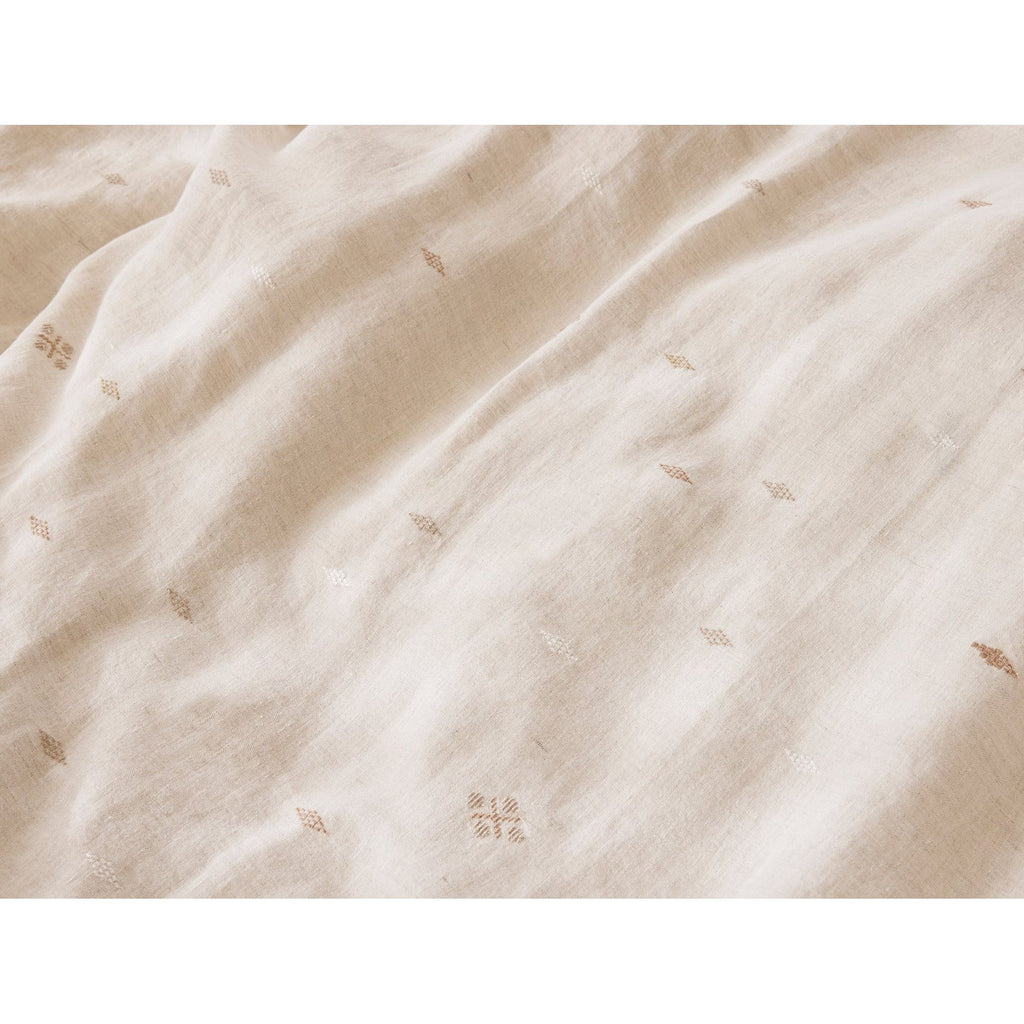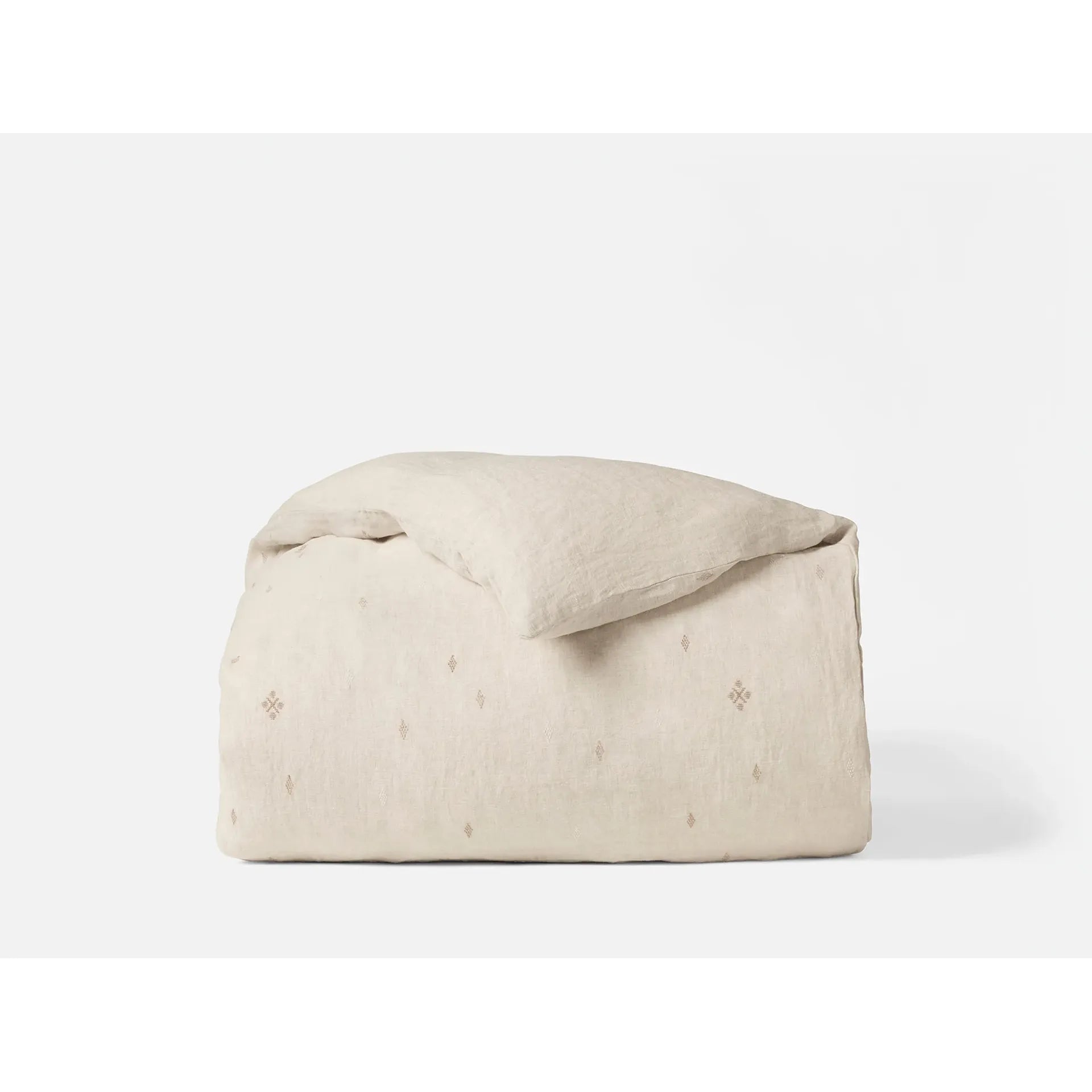 The Cambria Organic Duvet Cover exudes luxury, featuring a multicolor embroidery pattern that beautifully merges our archival designs with the intricate motifs of Okinawan bashofu, an ancient Japanese weaving tradition. It’s crafted from rare, 100% organic linen, grown naturally in France and woven in Portugal. Using shades of Doe, Undyed, and Praline, this duvet blends artistry with natural elegance for a timeless look.
