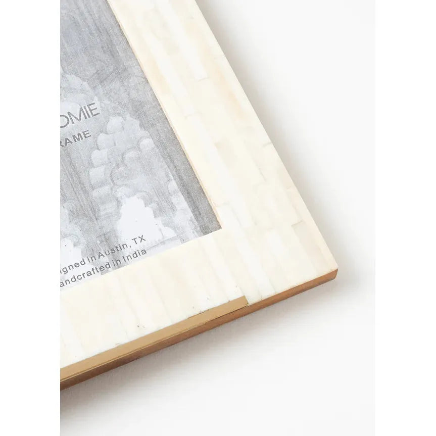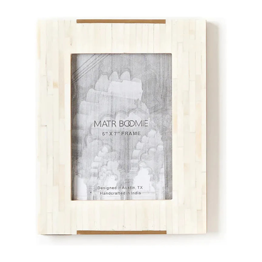 This handcrafted photo frame is thoughtfully designed for stylish display with inlaid bone tile accented by slim, gold finish brass bars at top and bottom. For convenient display this picture frame features a two-way table top easel and d-ring for hanging. Frame accommodates 5x7 photo or print, easily accessed with metal swivel tabs and access removable back.