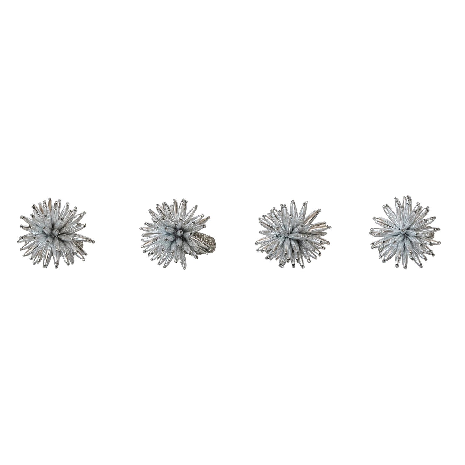 Handcrafted snowflake napkin rings measuring 1-3/4" in diameter and 3" high, featuring glass beads and a silver metal finish, accented with jute ties. Each ring is perfect for adding a festive, elegant touch to your table setting.