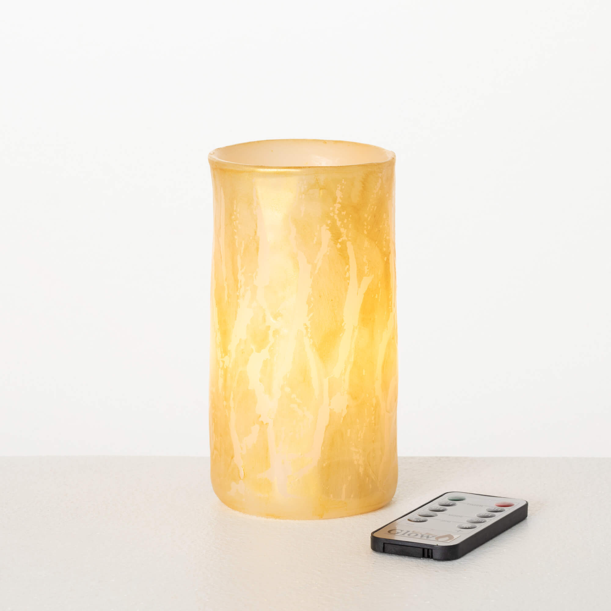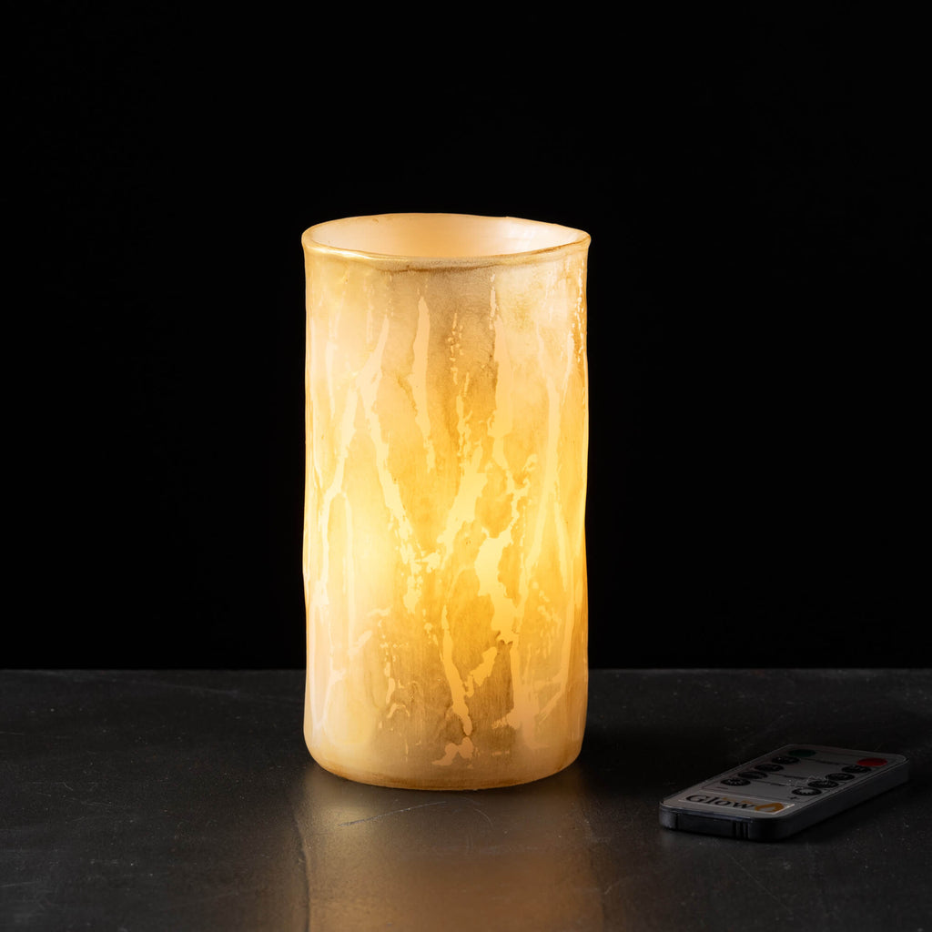 This modern candle makes a stylish design statement while bathing your space in a warm, cozy flameless glow. Not only is it safer, but it's also eco-friendly. Upgrade your accent lighting game with this trendy yet functional piece. The gold accent lends a luxe touch to the minimalist aesthetic. Best of all, the LED luminescence means you get that sought-after ambient lighting with the flick of a switch instead of an open flame. Unscented, timer and remote control included.